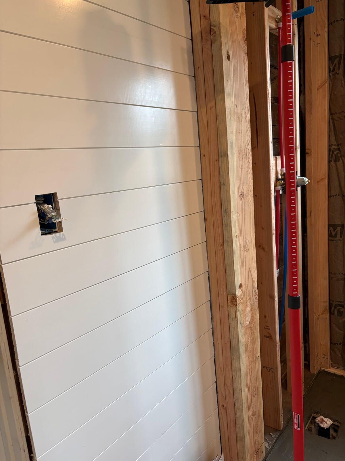 Bathroom rebuild after a leaking shower pan caused major floor rot. Love how the glossy shiplap, subway tile, and matte black fixtures turned out!